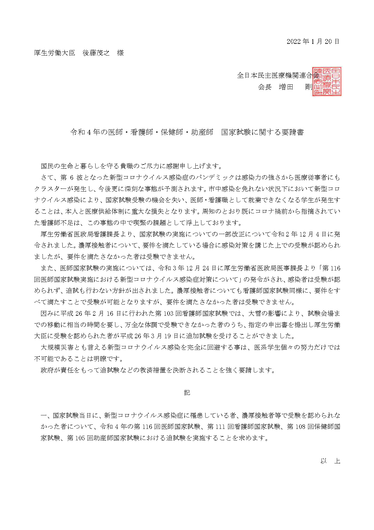 1月20日に厚労省・文科省に国試の追試を要請しました