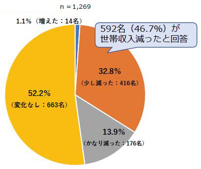 • 世帯収入がかなり減少したと179名(13.9%)が回答した。約半数が、世帯年収が減ったと回答しており、コロナ禍の影響の大きさと深刻さがうかがえる。
