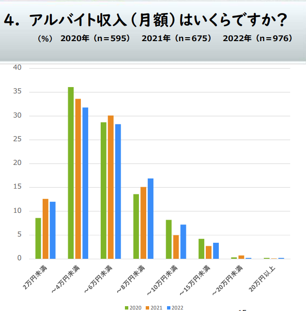 ① 前年度まで2回の調査では「アルバイトしている」「していない」は拮抗していたが、今回は「していた」「する予定」含めると8割を超えた。