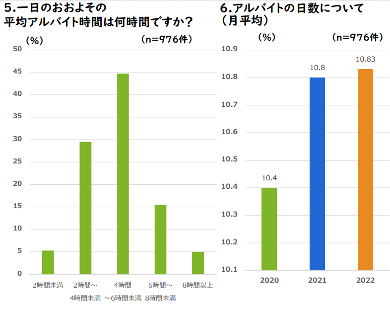 ③ 一日平均6時間~8時間、8時間以上と答えた看学生は2割を占めた。同様に深夜時間帯のアルバイトも決して少なくない。