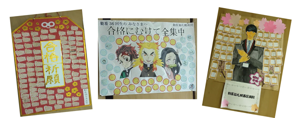 勤医協札幌看護専門学校の3年生に向けて、中央病院・札幌病院・西区病院の先輩職員が熱いメッセージ入りの合格祈念絵馬を作成しました。59名全員合格しました!
