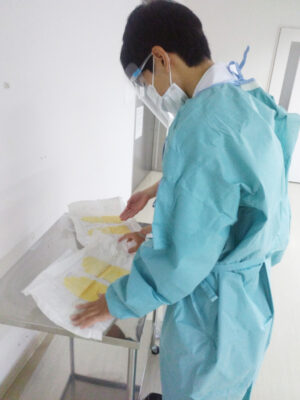 医師、直接介助看護師、外回り看護師役を決め、器機の名称も覚えて、ナーンちゃって手術体験をしました。緊張の中にも笑いありで、楽しく貴重な体験ができたと好評でした♡