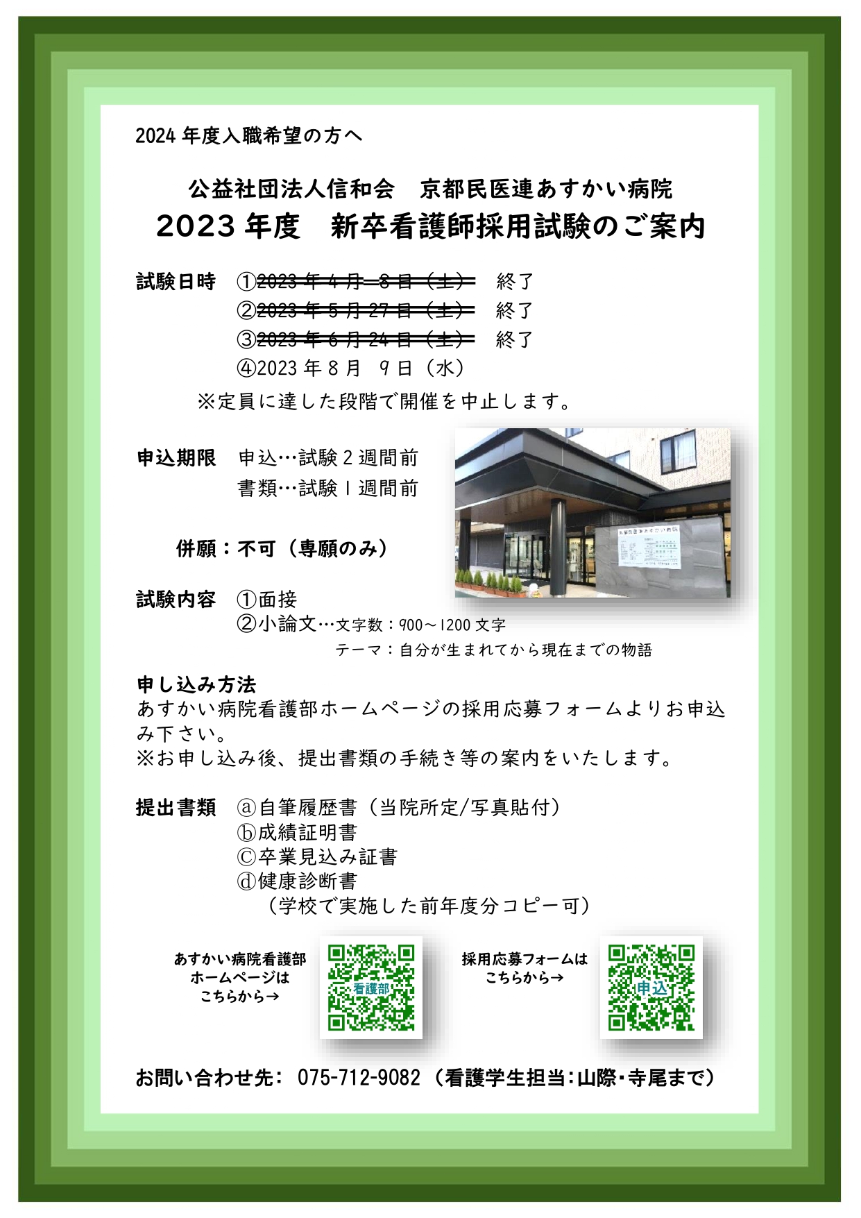 また、あすかい病院では、次年度入職の新人看護師を募集しています。次回の採用試験は、8月9日(水)となります。