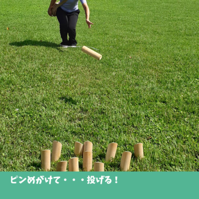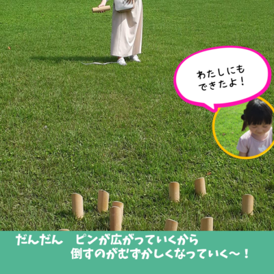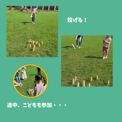ふかふかの芝生の上で行ったので思わぬところでピンが倒れて爆笑。