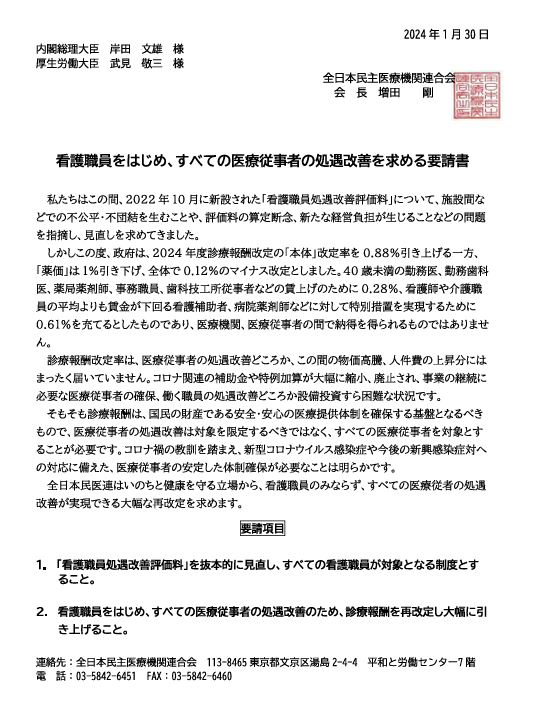是非、国の責任で国民のいのちを守り、地域医療を守るために、全ての看護師の処遇改善を求めます。そもそも診療報酬は、安全・安心の医療提供体制を確保する基盤となるべきものです。すべての医療従事者の処遇改善のため、診療報酬の大幅な引き上げを求めます。どうぞよろしくお願い致します。