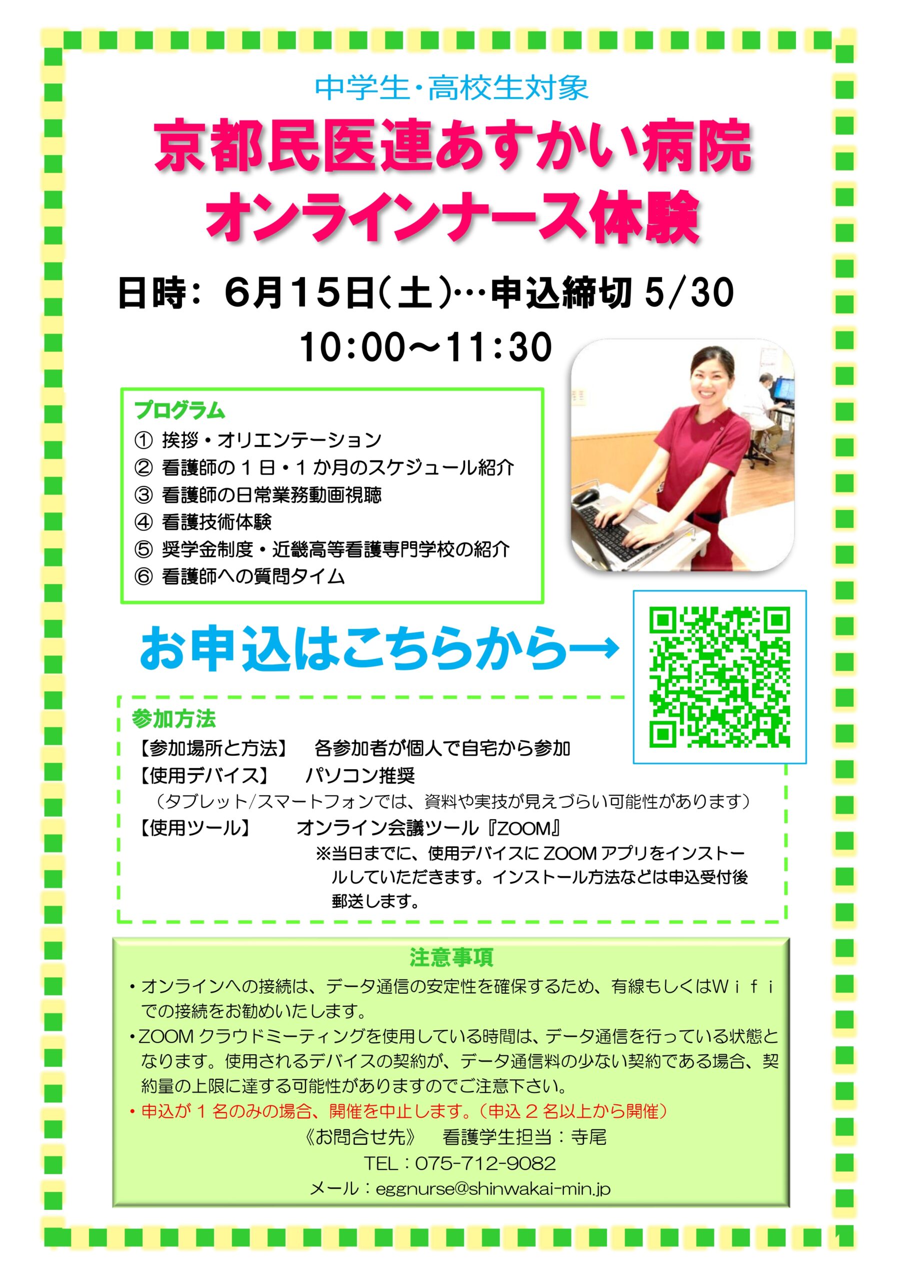 京都民医連あすかい病院では、中学生・高校生を対象にナース体験(オンライン)を開催しています。