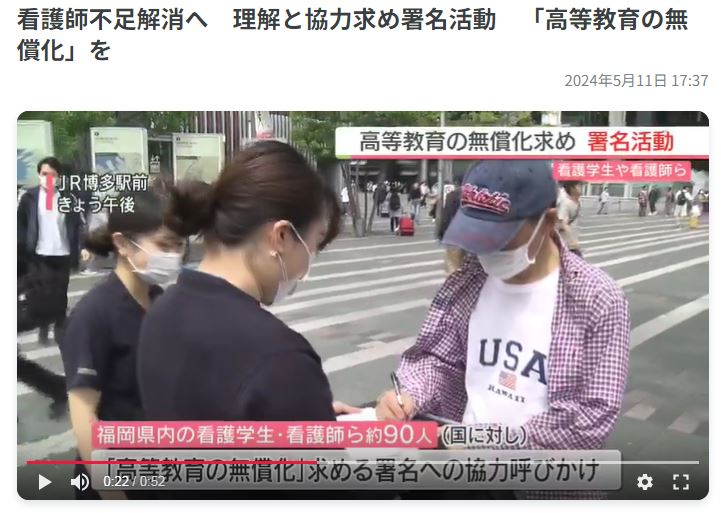 5月11日ナースアクション福岡実行委員会の取り組みとして福岡市のJR博多駅前で、福岡県内の看護学生・看護師、約90人が、国に対し「高等教育の無償化」を求める署名への協力を呼びかけました。