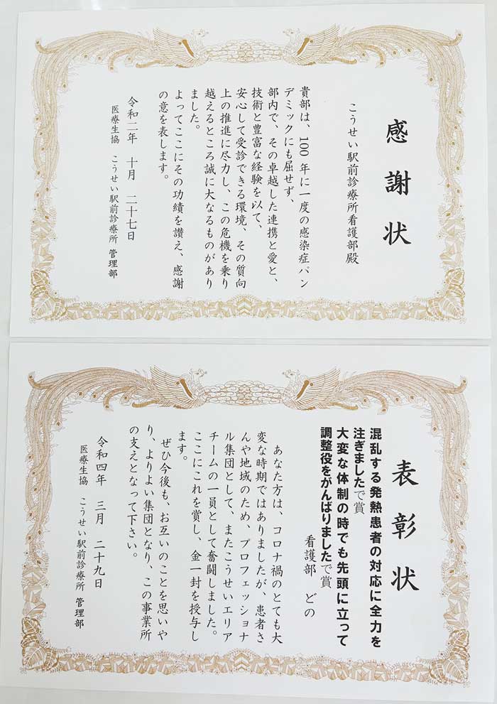 ▲診療所管理部から看護部へ、頑張りの評価を表彰状にして