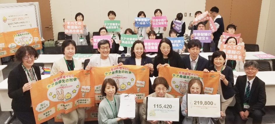 5月28日にナースアクションの一環として「高等教育無償化を求める省庁交渉」を国会内で行いました。看護学校教員は『お肉は高くて買えないから、タンパク質はお豆腐でまかなっている』などの学生の切実な声を紹介、『7割が奨学金を借り、多くの学生が生活費のためにアルバイトをせざるを得ない。いざ臨床に出ても、多額の借金を背負い、日々返済のために働いている。これが、日本の社会を担う若者の実態であって良いのでしょうか』と国に迫りました。