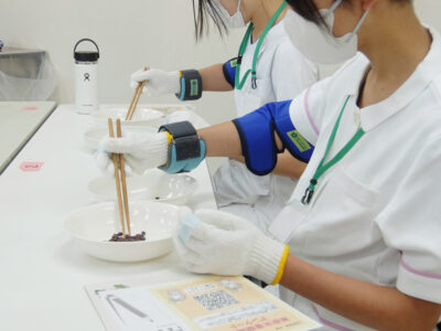 集合での体験では白衣を着用します。はじめに高齢者の身体について理解を深めてもらうために、高齢者疑似体験をしました。キットを使い加齢によって関節の動かしづらさや目の見えにくさ、音の聞こえにくさを体験してもらい患者さんへの接し方を学んでから患者さんのもとへケアに行きました。