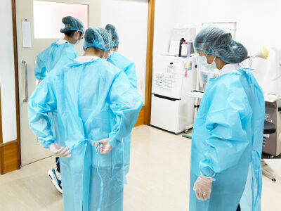 コロナ禍では院内で半日開催し、防護服着用や車いす操作、視力・聴力検査などの実技を体験していただきました。検査する側として器機に触れていただき、気づきを得ていただけた体験となりました