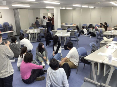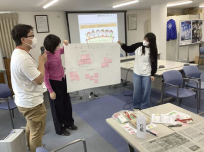 前半は、京都民医連の紹介、奨学生の心得や役割、看護学校で何を学んでほしいか、などをレクチャー。後半はグループ対抗ゲームで人間知恵の輪をおこなったあと、先輩看護師2人から、実習や勉強のこと、学生生活や国試勉強についてアドバイスをもらいました。「実習で自分で調べてみてもわからないことは素直に相談してくれたら大丈夫」「日頃の授業と先生の話をしっかり聞くこと」「実習中は勉強する時間の確保は難しいから、学校での勉強の時間は貴重」「バイトと勉強はメリハリが大事」「実習のときホッチキスと付箋を持っていたらヒーローになれる」など、他にも病棟でのやりがいなど話してくれました。