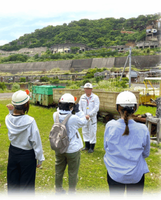 5月31日(土)晴天。学習の一環として九州で最後まで稼働していた池島炭鉱へ見学に行きました。参加者は看護学生2名、診療所看護師2名、医学生3名、薬学生1名、病院事務職員2名の計10名。一般向けの観光ツアーのため池島炭鉱の歴史や掘削方法、使用されていた機械についても学びつつ、元炭坑保安職員のガイドさんより坑内の保安設備や作業員の装備品、厳しい安全マニュアルなどの詳しい説明も受けることができました。