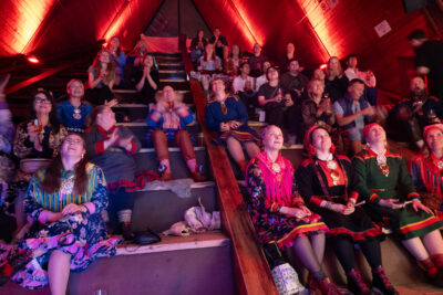 ▲サーミ議会で最も議席を多く持つNSR政党とサーミ議長(一番下・右から3人目の黒い民族女性着用)。オスロのサウナ施設で開票結果を見守る。同政党の南部地区の立候補者1番は2000年生まれ(一番下・左の青い衣装着用)