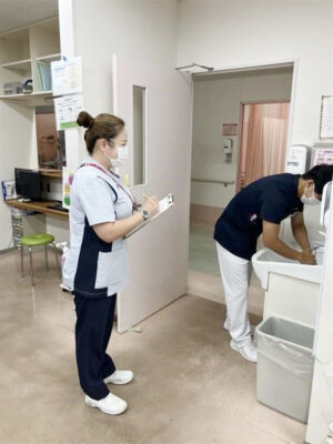 2023年11月に感染管理認定看護師の資格を取得し、現在感染対策室に勤務しています。現在は、法人内の感染対策として、他部署の方々からも協力を得て、感染症発生時の対応、各部署への感染ラウンド、職員への感染対策研修、物品管理、NEWSを発行し情報の発信等をしています。その他には、地域の高齢者福祉施設に出向き、感染対策についての実施指導等を行い、また、保健所や地域の感染管理認定看護師の方と連携を図り、感染対策リーダー養成研修の講師なども行っています。